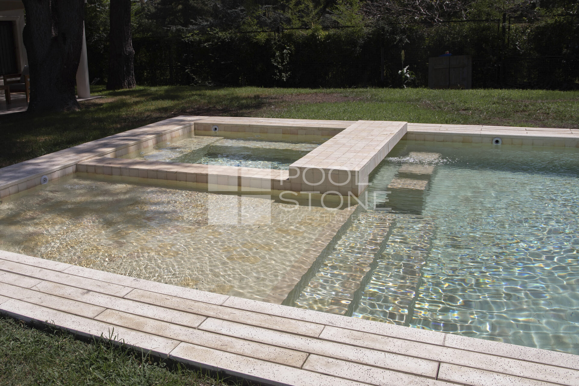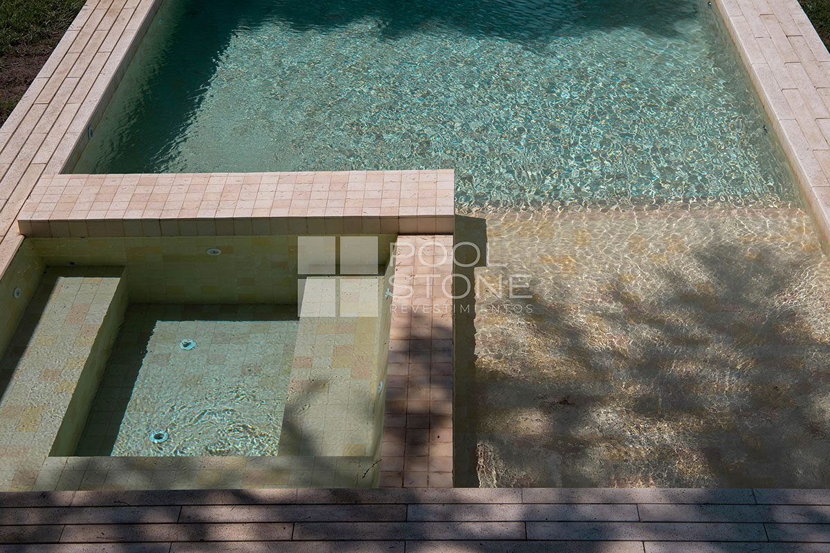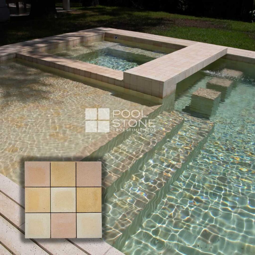 Revestimiento marmolítico prensado. Contiene insumos minerales de calidad, polímeros y aditivos que brindan beneficios relacionados al mantenimiento, y practicidad para los usuarios de las piletas.